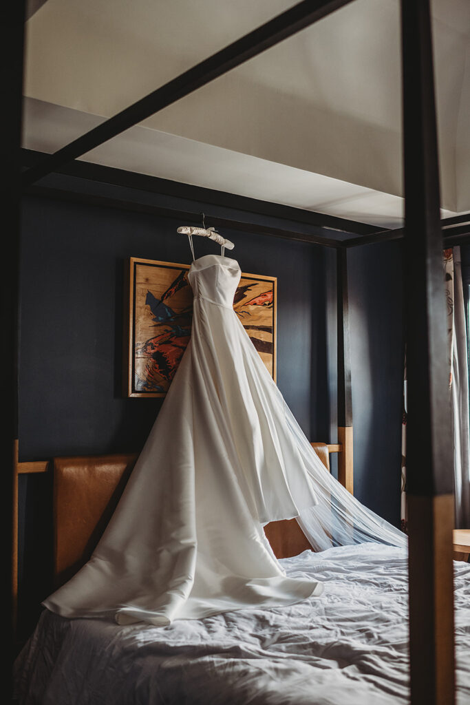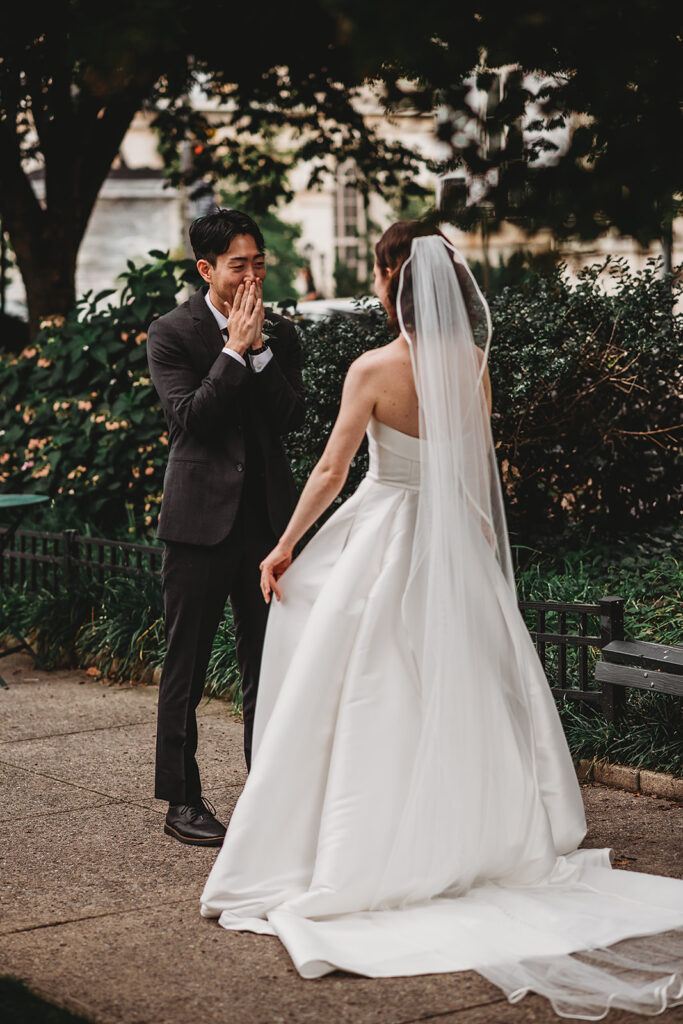 Tucked away in Mount Vernon, Hotel Revival is a gem of a spot for wedding day prep. The rooms are flooded with natural light (a dream for photography!), and the interiors offer a perfect mix of contemporary design and classic Baltimore character. The couple had separate suites, each filled with laughter, a few happy tears, and the buzz of excitement as they prepared to see each other for the first time. I especially love the way the bold wallpaper and vintage mirrors added depth and texture to the portraits. In addition, the courtyard out front made for a serene moment before we headed to the ceremony. Just the two of them, with the lush gardens in the background.
