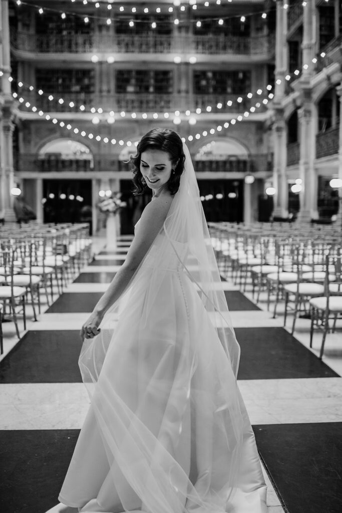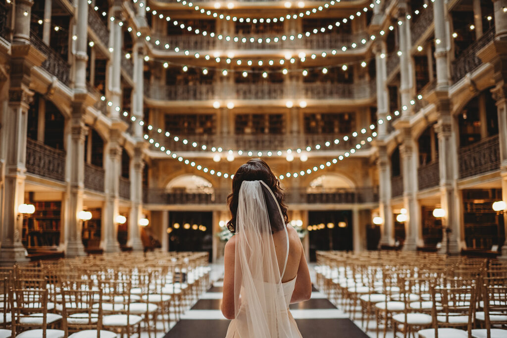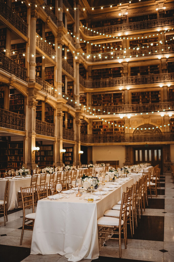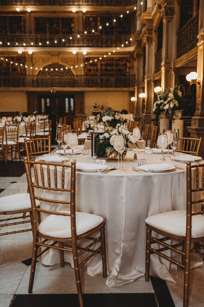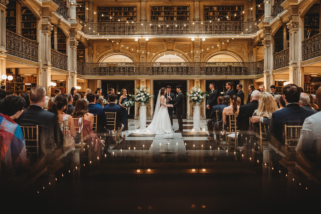 The George Peabody Library Maryland is nothing short of breathtaking. Known as one of the most beautiful libraries in the world, it’s easy to see why so many couples are drawn to its grand architecture and intimate ambiance. The ceremony took place beneath the soaring atrium, surrounded by walls of books that felt both timeless and deeply romantic. As the sun dipped lower, the ambient lighting gave the space a warm, golden glow. Absolutely perfect for moody, elegant portraits and a candlelit dinner. It’s the kind of venue that doesn’t need much decor because the space itself tells such a strong visual story. And as a Baltimore wedding photographer, I feel confident when I say it is my favorite in the city!
