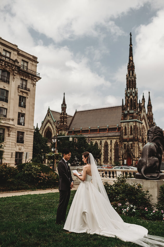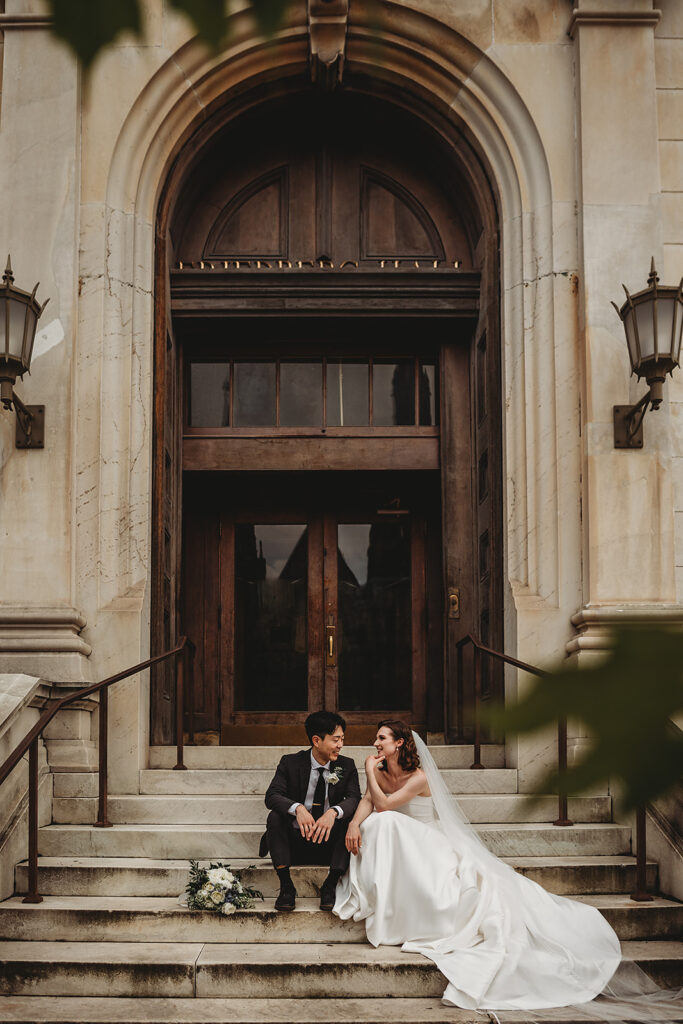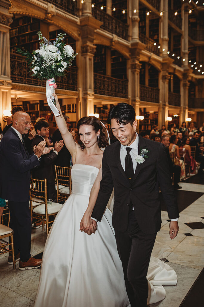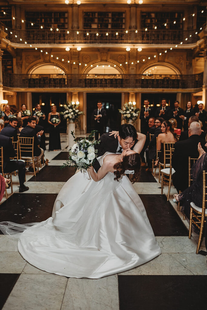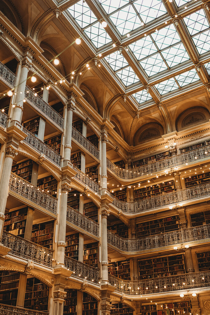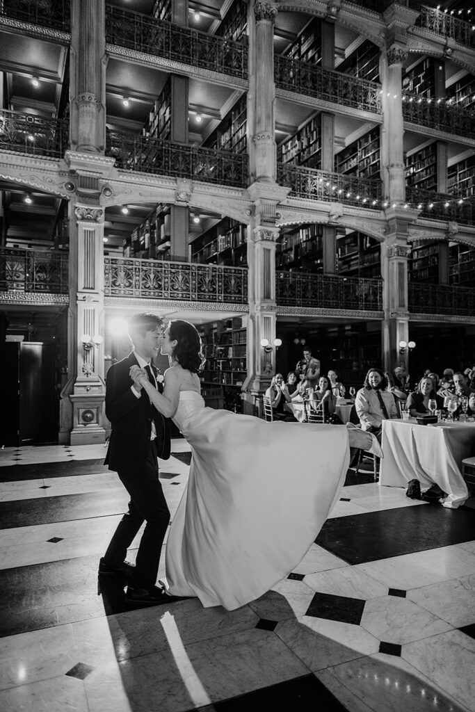 The George Peabody Library Maryland is nothing short of breathtaking. Known as one of the most beautiful libraries in the world, it’s easy to see why so many couples are drawn to its grand architecture and intimate ambiance. The ceremony took place beneath the soaring atrium, surrounded by walls of books that felt both timeless and deeply romantic. As the sun dipped lower, the ambient lighting gave the space a warm, golden glow. Absolutely perfect for moody, elegant portraits and a candlelit dinner. It’s the kind of venue that doesn’t need much decor because the space itself tells such a strong visual story. And as a Baltimore wedding photographer, I feel confident when I say it is my favorite in the city!